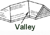 Valley: The angle formed at the intersection of two sloping roof surfaces.